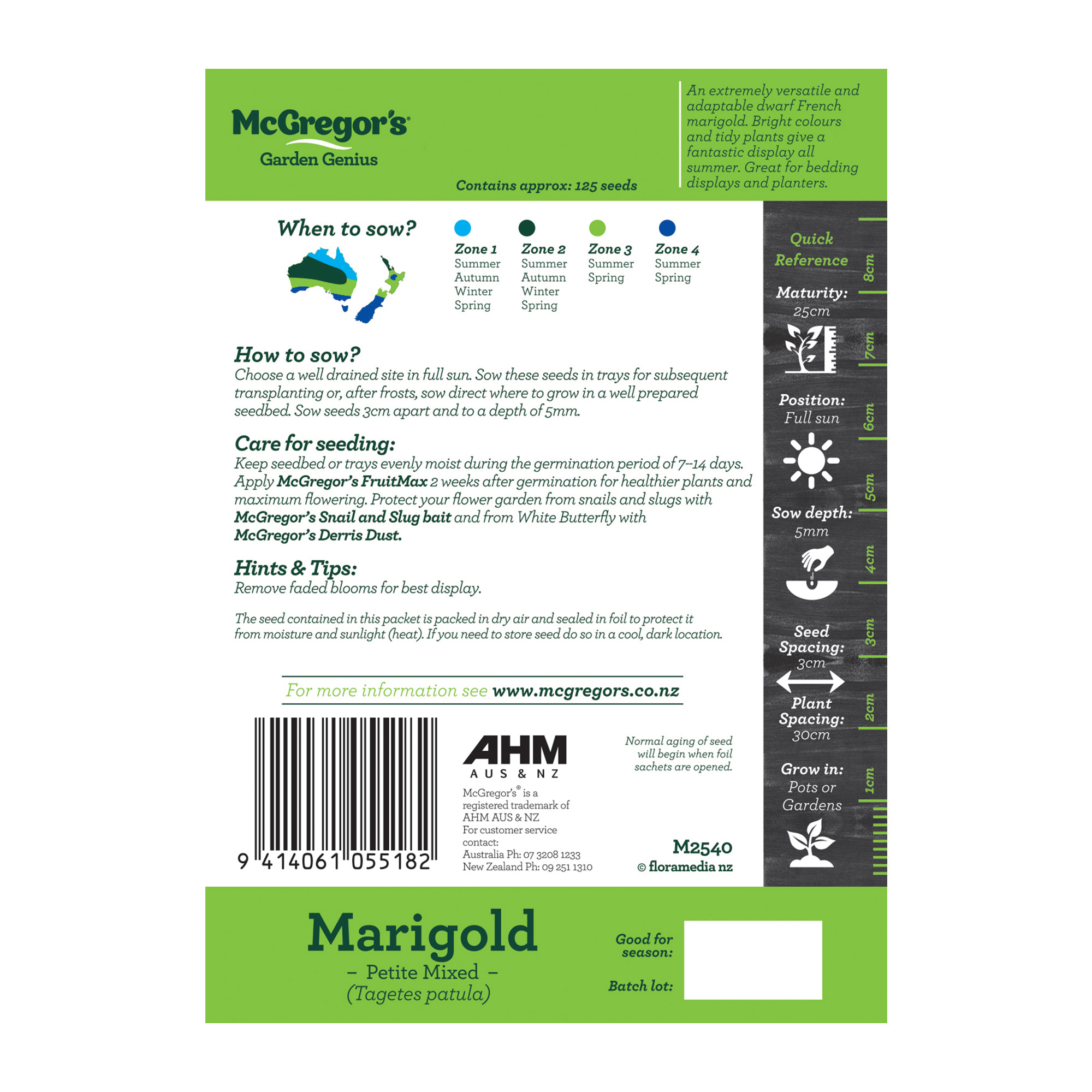 An extremely versatile and adaptable dwarf French marigold. Bright colours and tidy plants give a fantastic display all summer. Great for bedding displays and planters