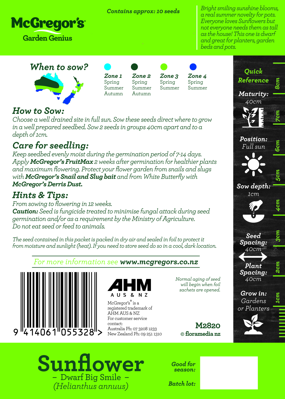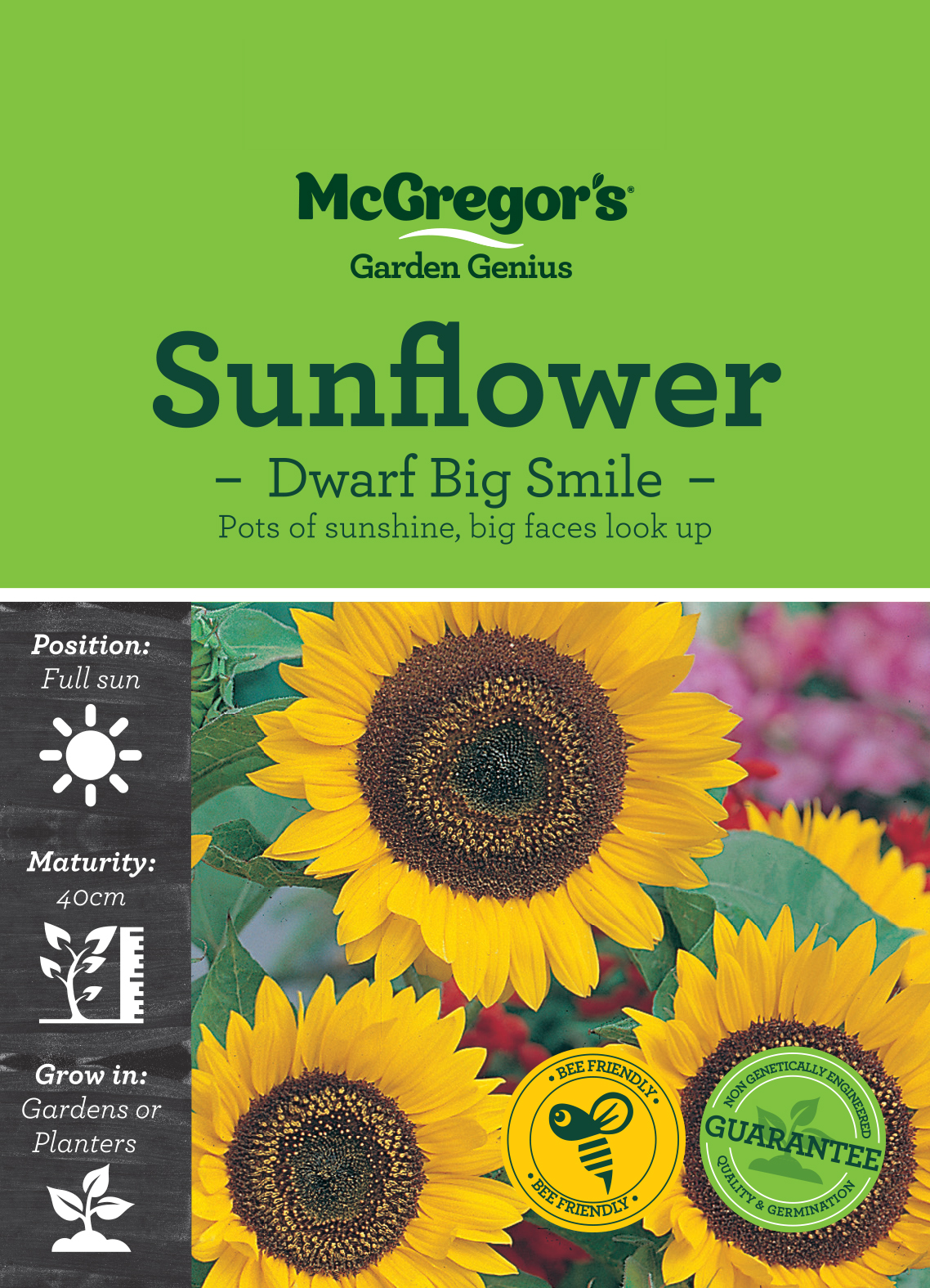 Bright smiling sunshine blooms, a real summer novelty for pots. Everyone loves Sunflowers but not everyones needs them as tall as the house. This one is dwarf and great for planters, garden beds and pots.