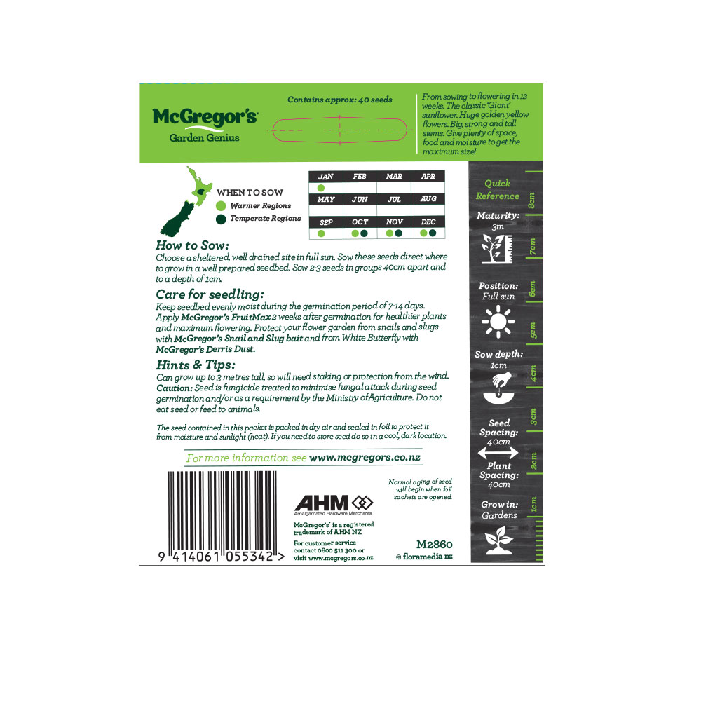 From sowing to flowering in 12 weeks. The classic 'Giant' sunflower has golden yellow flowers and big, strong and tall stems. Give plenty of space, food and moisture to get the maximum size.Where to buy