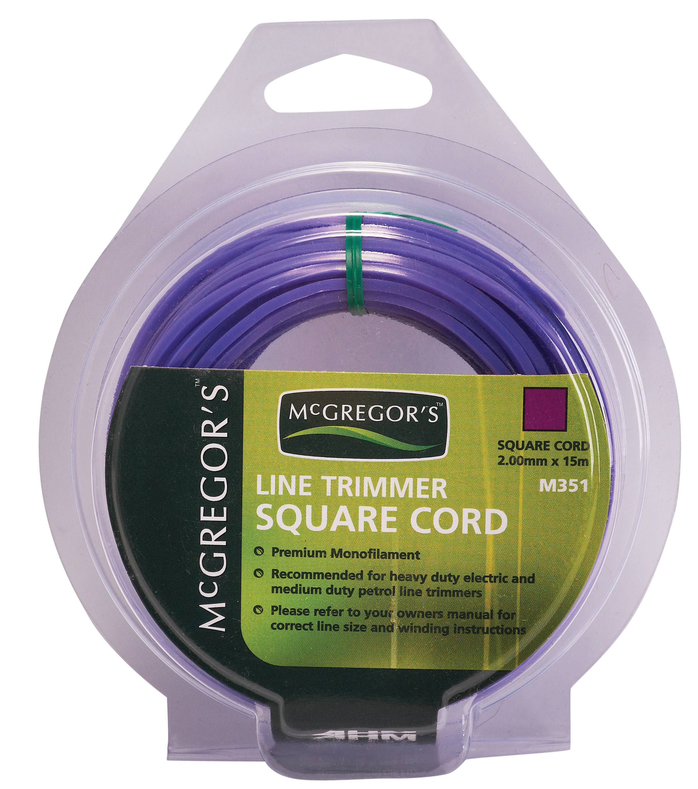 This purple, square cut trimmer cord is made from premium monofilament. Square line will fit most bent shaft petrol (auto feed)or larger electric (600w & up) line trimmers.