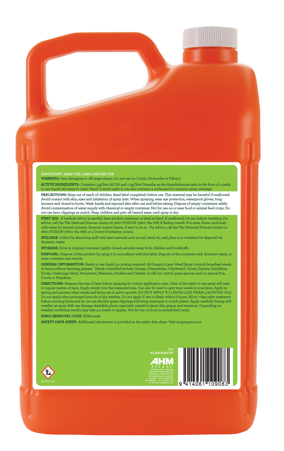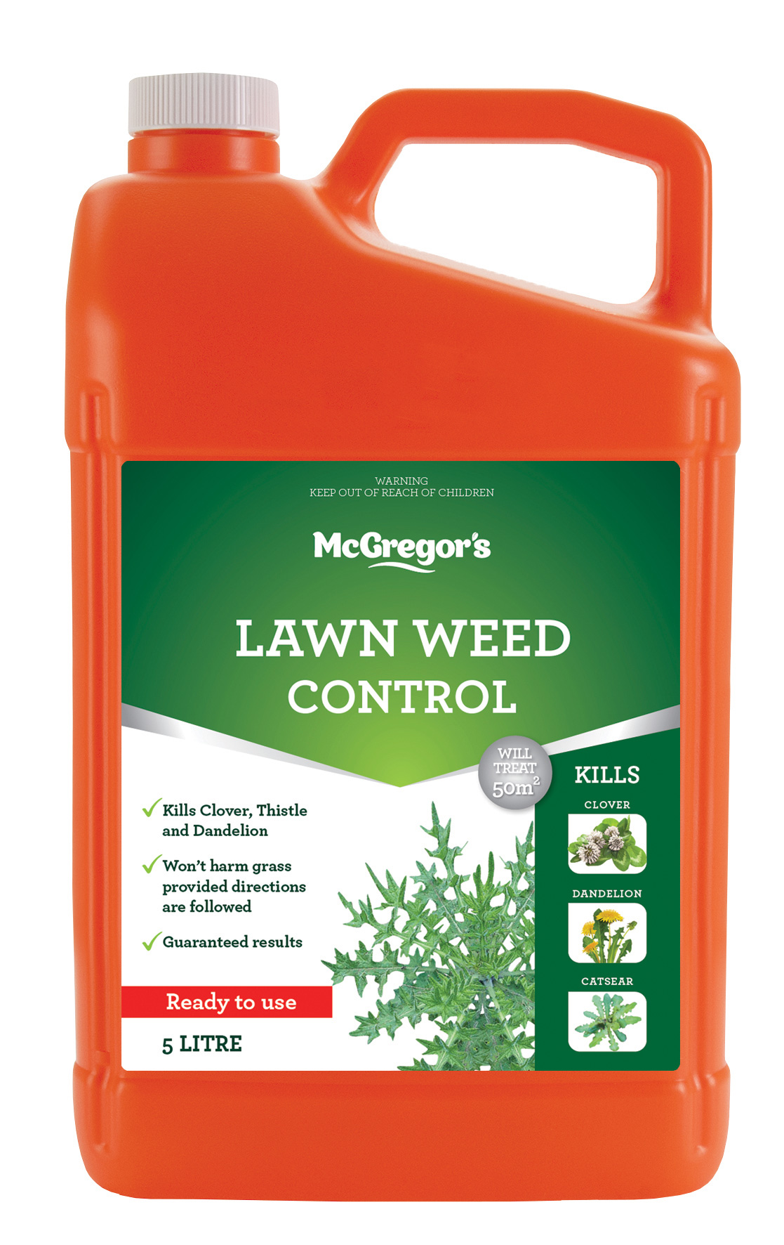 McGregor's Lawn Weed Control controls Broadleaf weeds in lawns without harming grasses including Catsear, Chamomiles Chickweed, Clover Dandelion, Docks, Onehunga Weed, Prickles & Thistles.