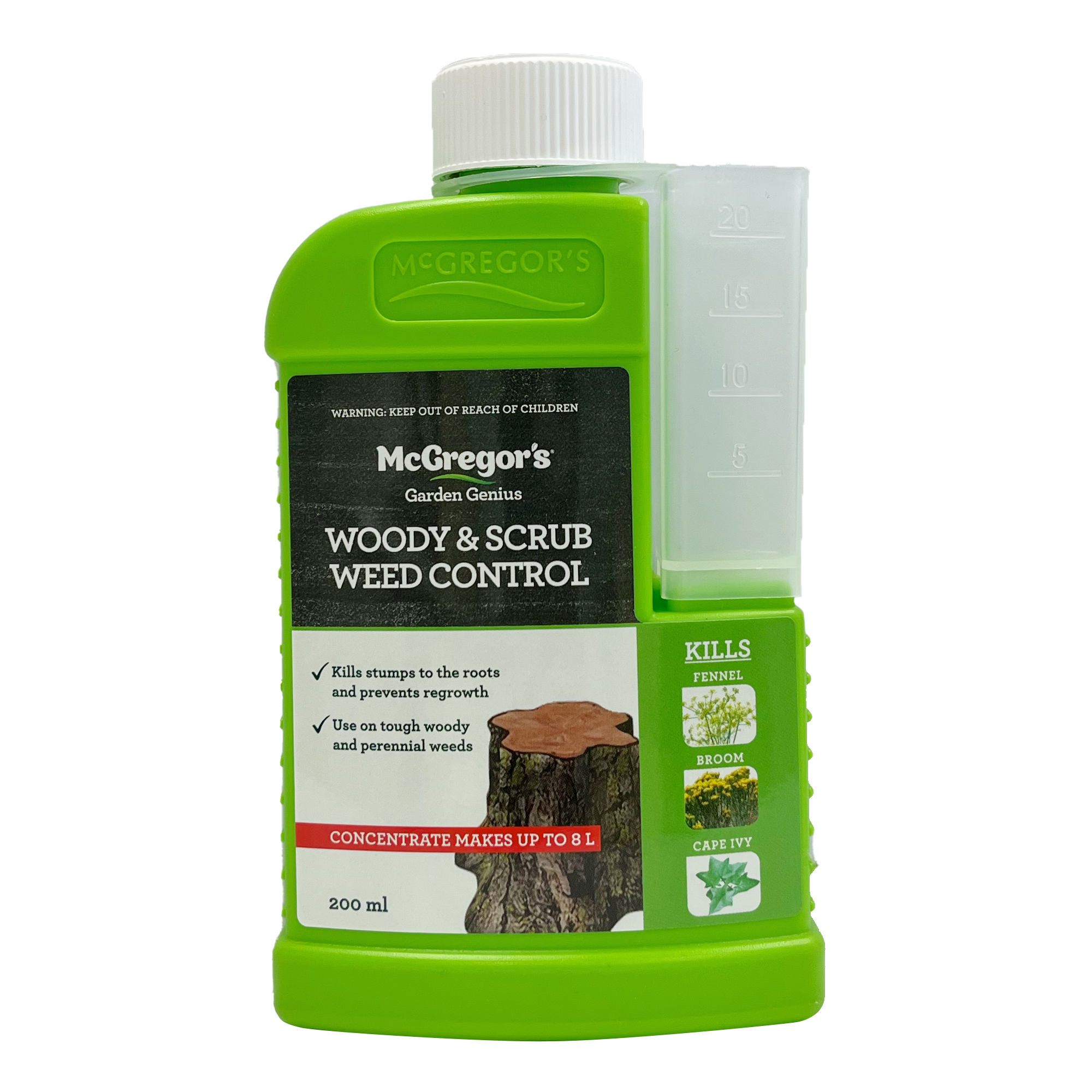 McGregor's Woody and Scrub Weed Control is for use on woody scrub and hard to kill weeds including Brooms Fennel, inkweeds, Lupin Buttercups, Cape Ivy Convolvulus, Docks, Poplar Privet, Sorrel, Thistle Willow and Stumps