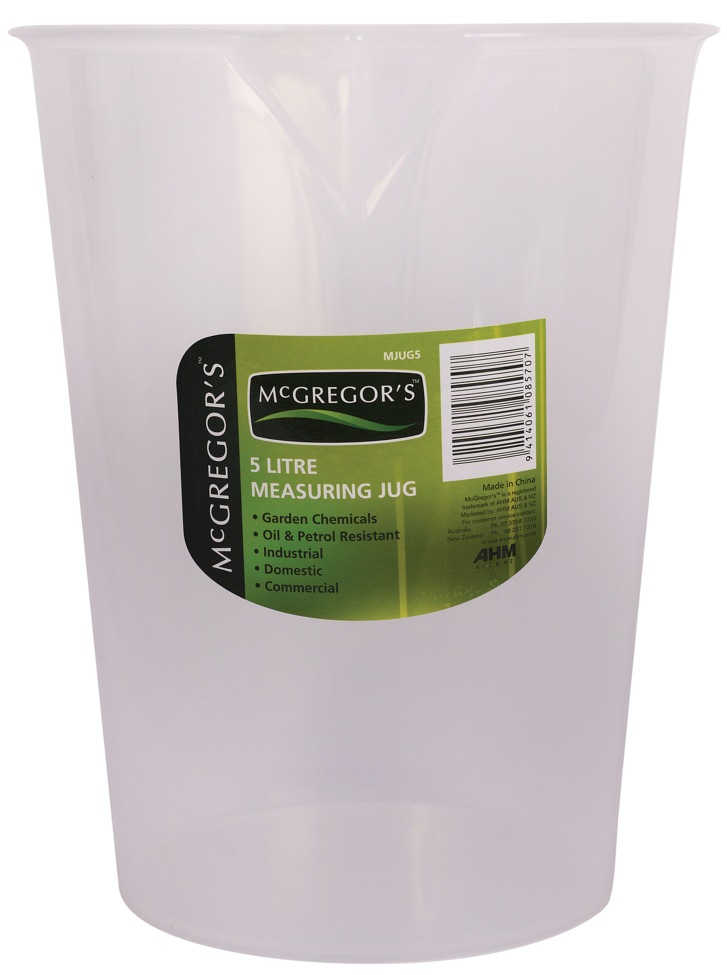 This opaque graduated plastic measuring jug has a 5L capacity, and graduates in 100ml increments. Ideal for garden chemicals.