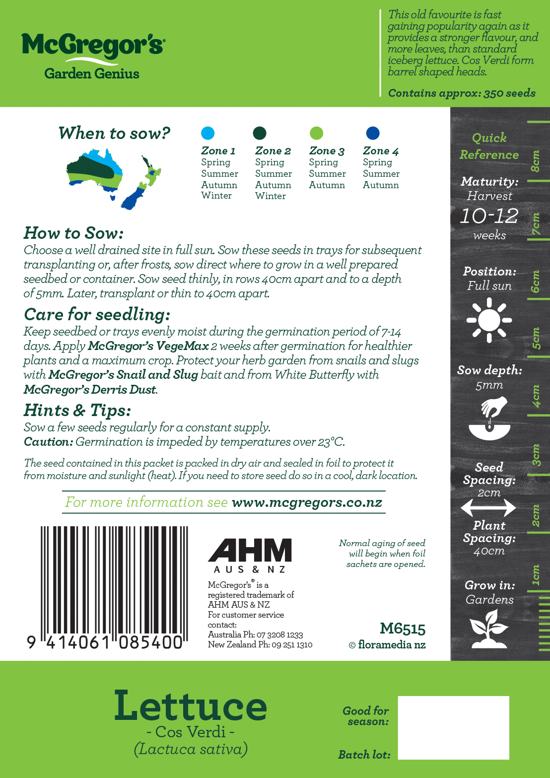 Lettuce Seed Cos Verdi Code: M6515 2 A hight quality, green selection of Cos Lettuce. Very uniformed, compact habit with well filled hearts. Where to buy Select your region to find your nearest McGregor’s stockist. Find