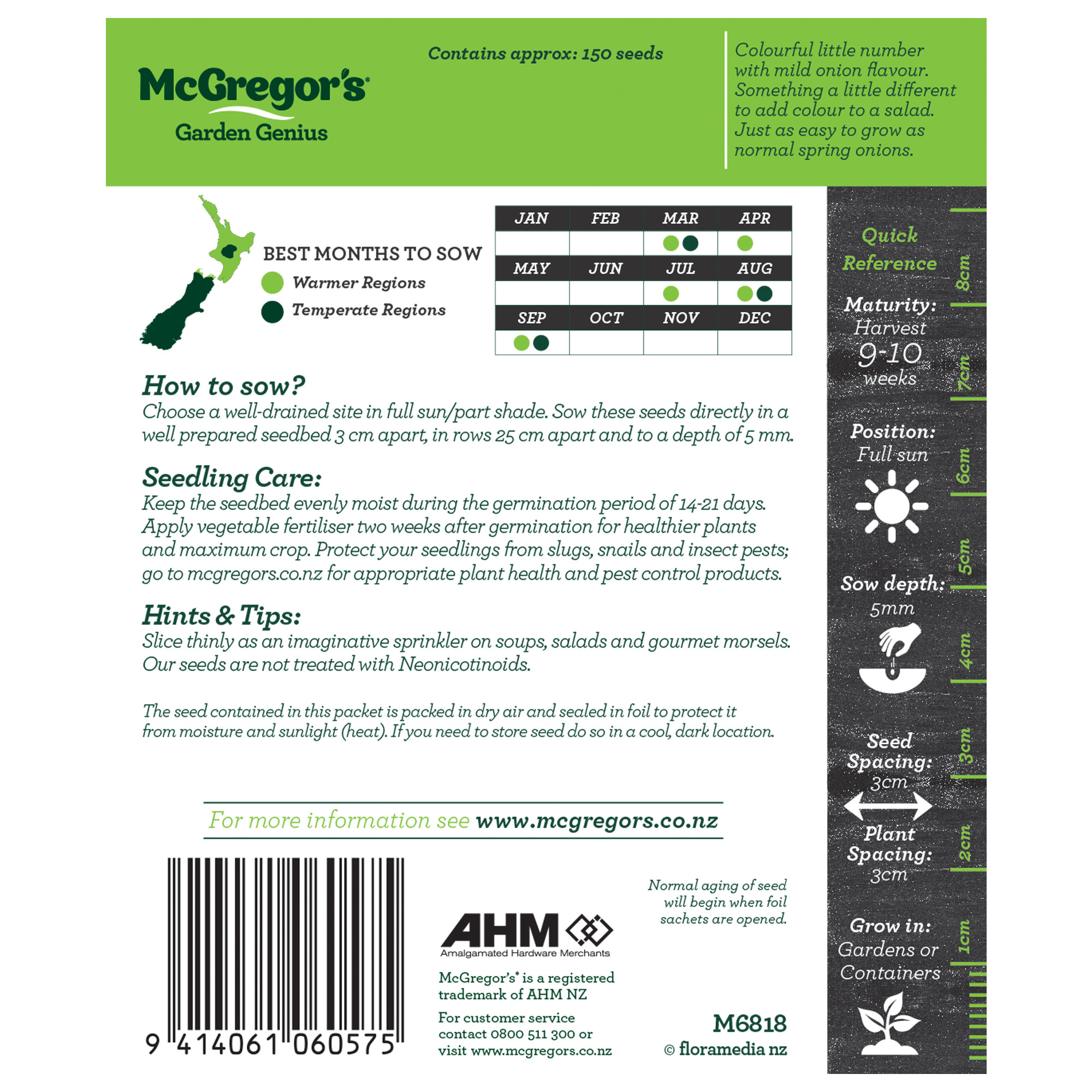 • Seedling Care: Keep the seedbed evenly moist during the germination period of 14-21 days. Apply vegetable fertiliser two weeks after germination for healthier plants and maximum crop. Protect your seedlings from slugs, snails and insect pests; go to mcgregors.co.nz for appropriate plant health and pest control products.