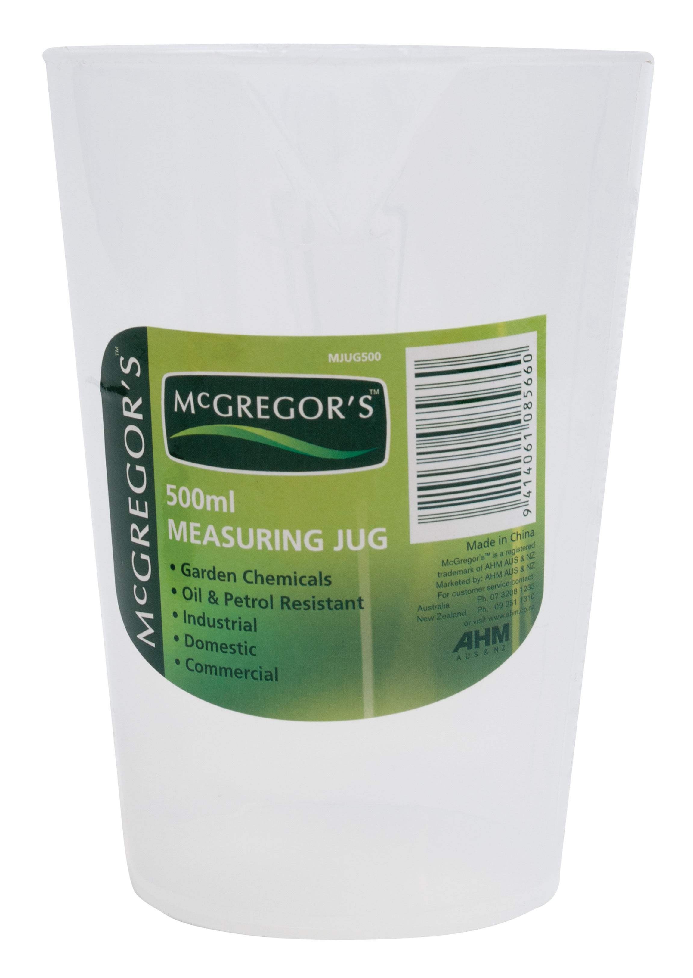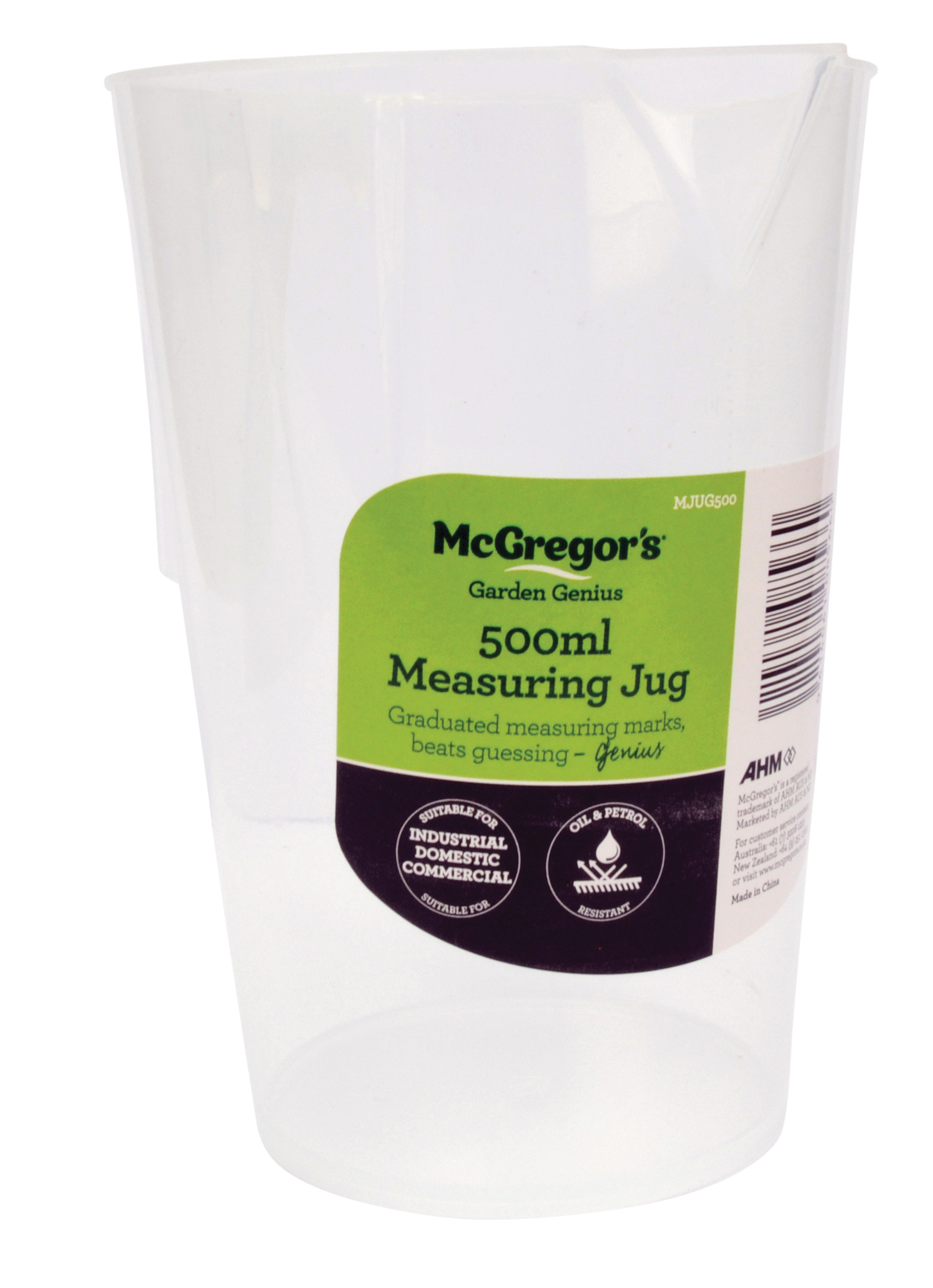 This opaque graduated plastic measure jug has a 500ml capacity and features clear 10ml graduations. It is oil and petrol resistant.Where to buy
