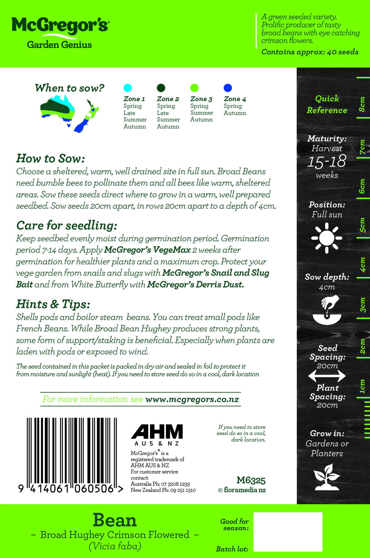 Prolific producer of tasty broad beans with eye catching crimson flowers. Contains approximately 40 seeds. Choose a sheltered, warm, well drained site in full sun. Broad Beands need bumble bees to pollinate them and all bees like warm, sheltered areas. Sow these seeds direct where to grow in a warm, well prepared seedbed. Sow seeds 20cm apart, in rows 20c, apart to a depth of 4 cm.