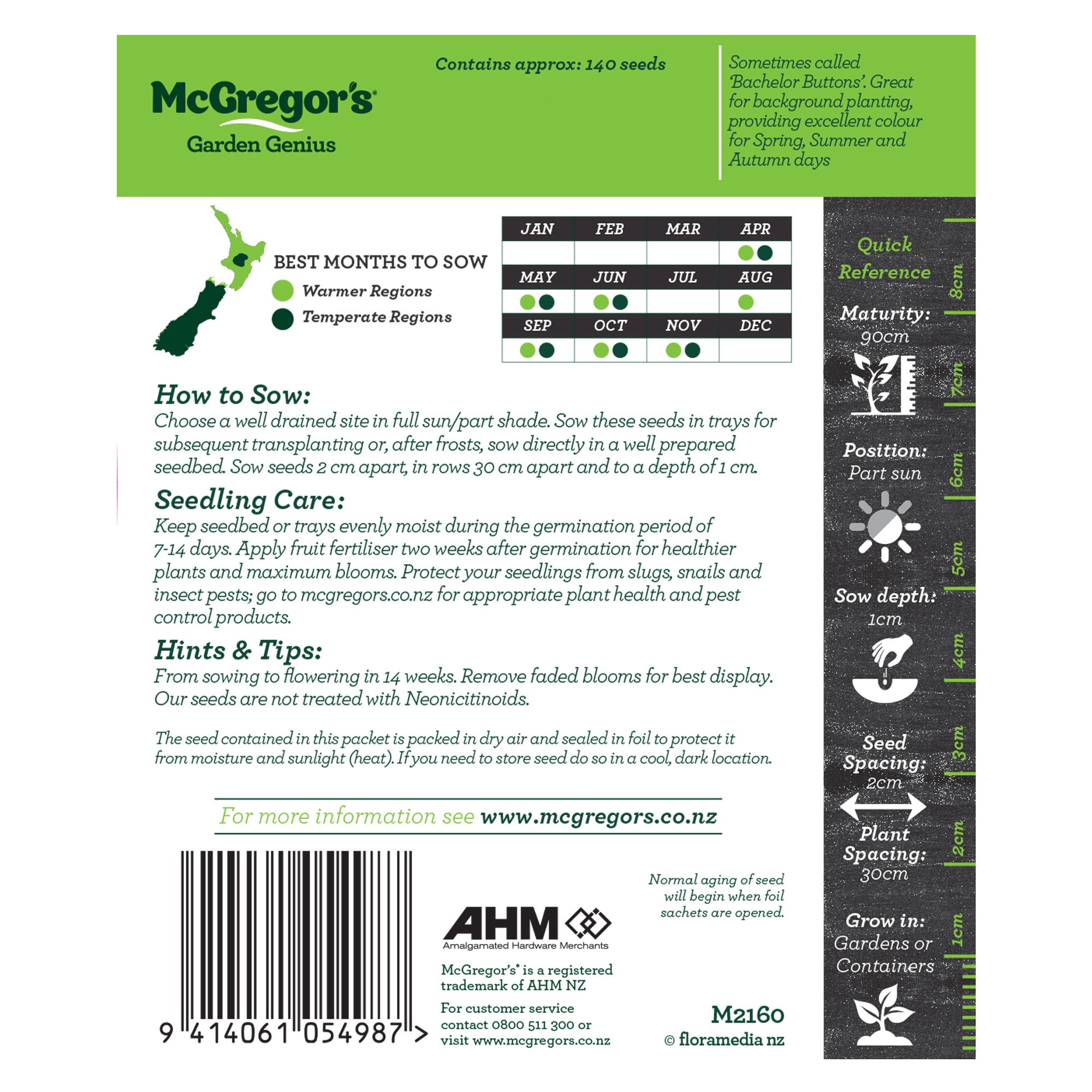 Sometimes called 'Bachelor Buttons'. Great for background planting, providing excellent colour for Spring, Summer and Autumn daysWhere to buy