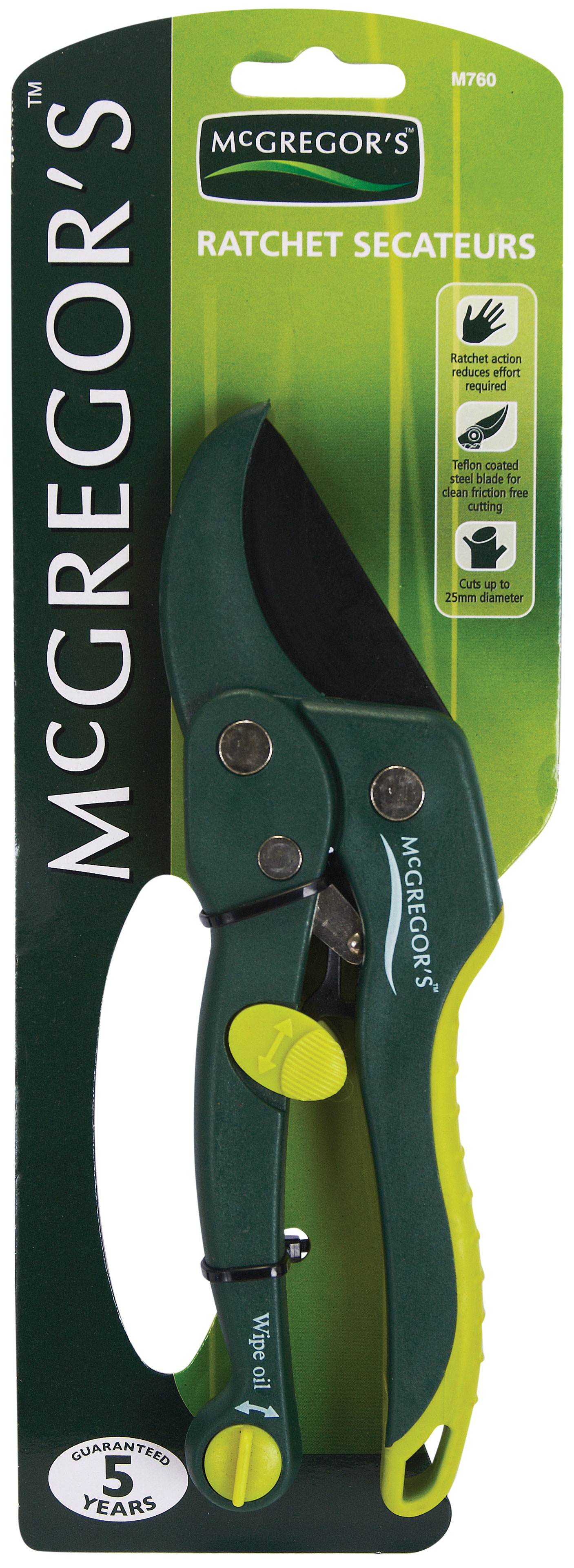 The ratchet action secateur helps multiply the power of the user and requires minimum strength to function. The curved style non-stick coated blade provides a clean friction free cut while the built-in oil wiper makes for easy maintenance.Where to buy