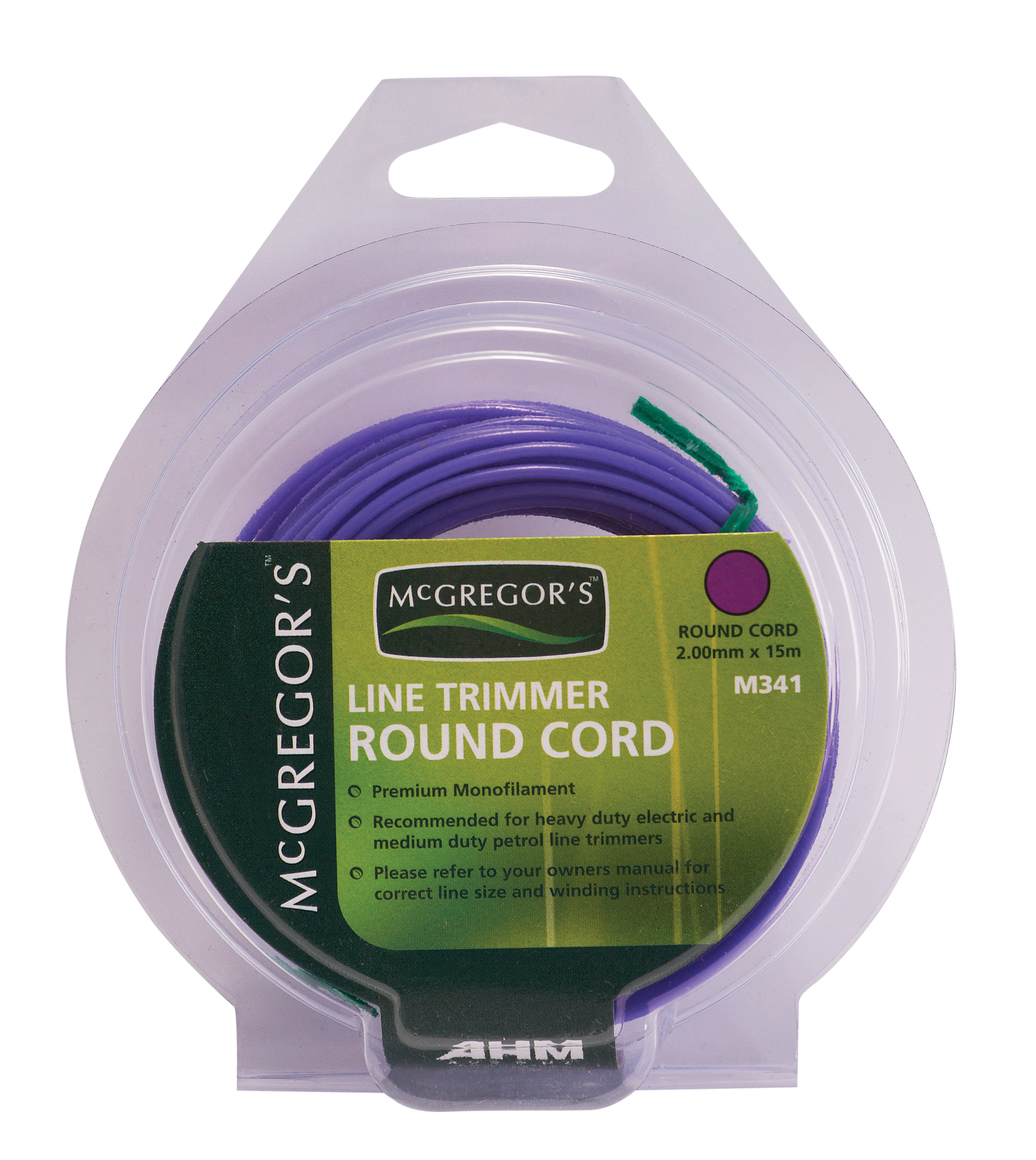 This purple, round cut trimmer cord is made from premium monofilament and will fit most bent shaft petrol (auto feed) or larger electric (600w & upwards) line trimmers