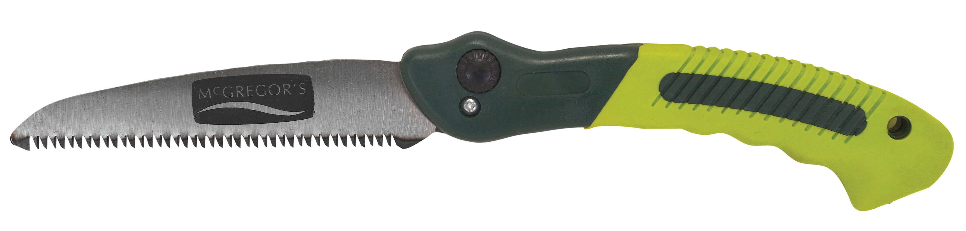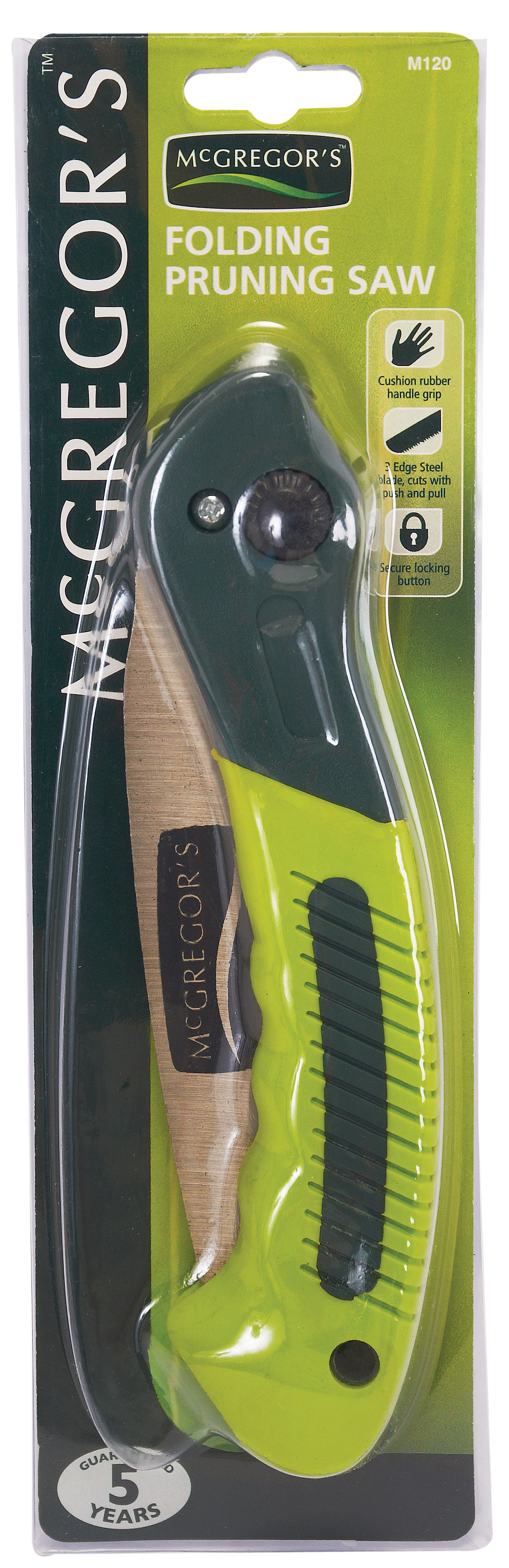 This folding pruning saw features a tri-beveled blade with razor sharp teeth making cutting on both push and pull strokes faster and easier. It also features a secure locking lever for safety and cushioned hand grip for comfort.