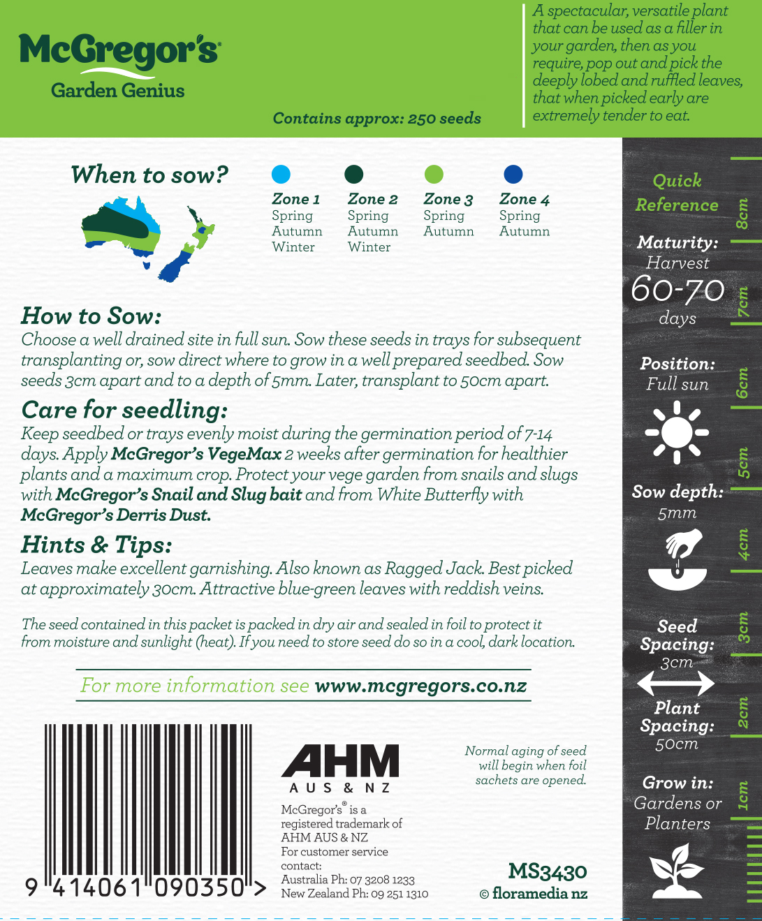 Surprisingly sweet flavour. A spectacular, versatile plant that can be used as a filler in your garden, then as your require, pop out and pick the deeply lobed and reffled leaves, that when picked early are extremely tender to eat.