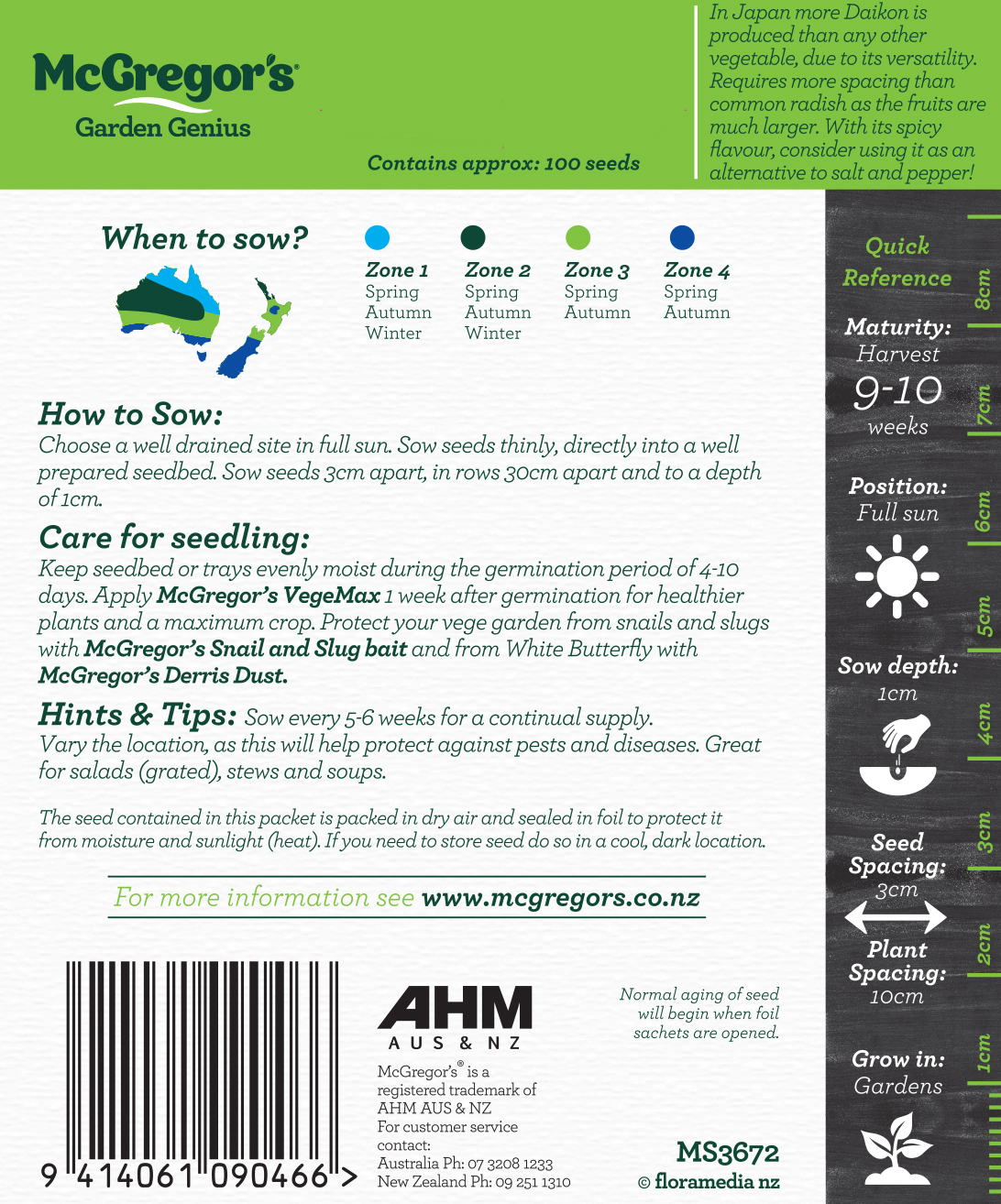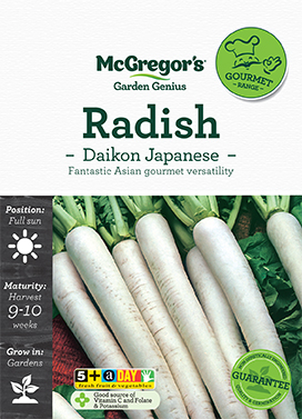 Radish Seed Daikon Japanese Code: MS3672 Buy online. Available to buy online.Click here 1 A favourite vegetable for oriental dishes. Where to buy Select your region to find your nearest McGregor’s stockist. Find