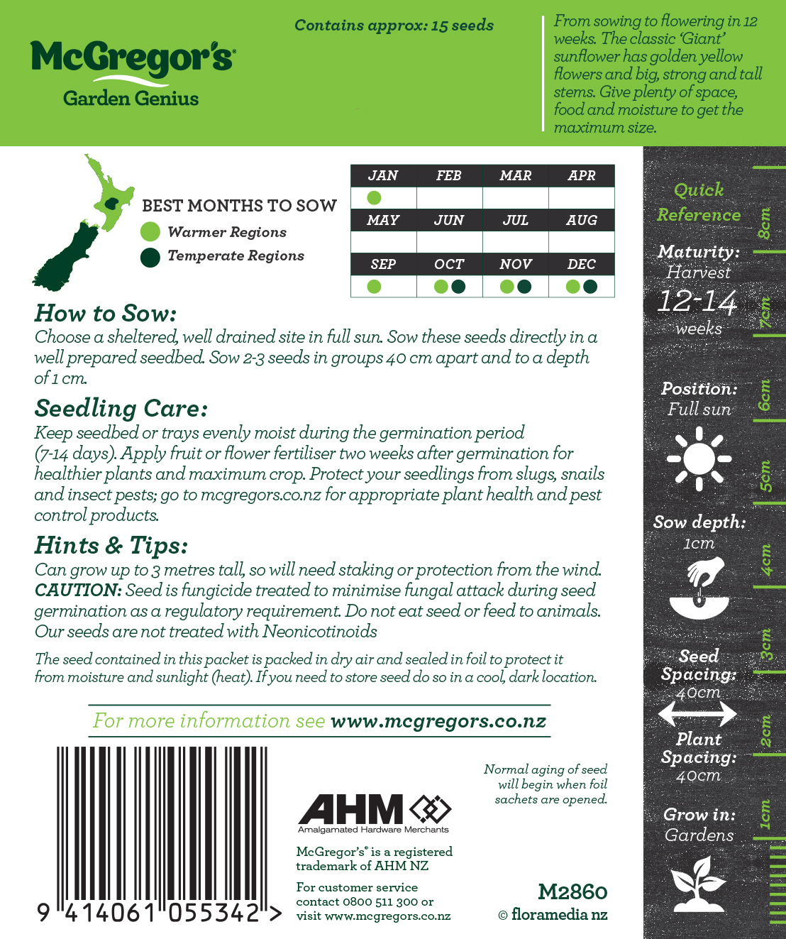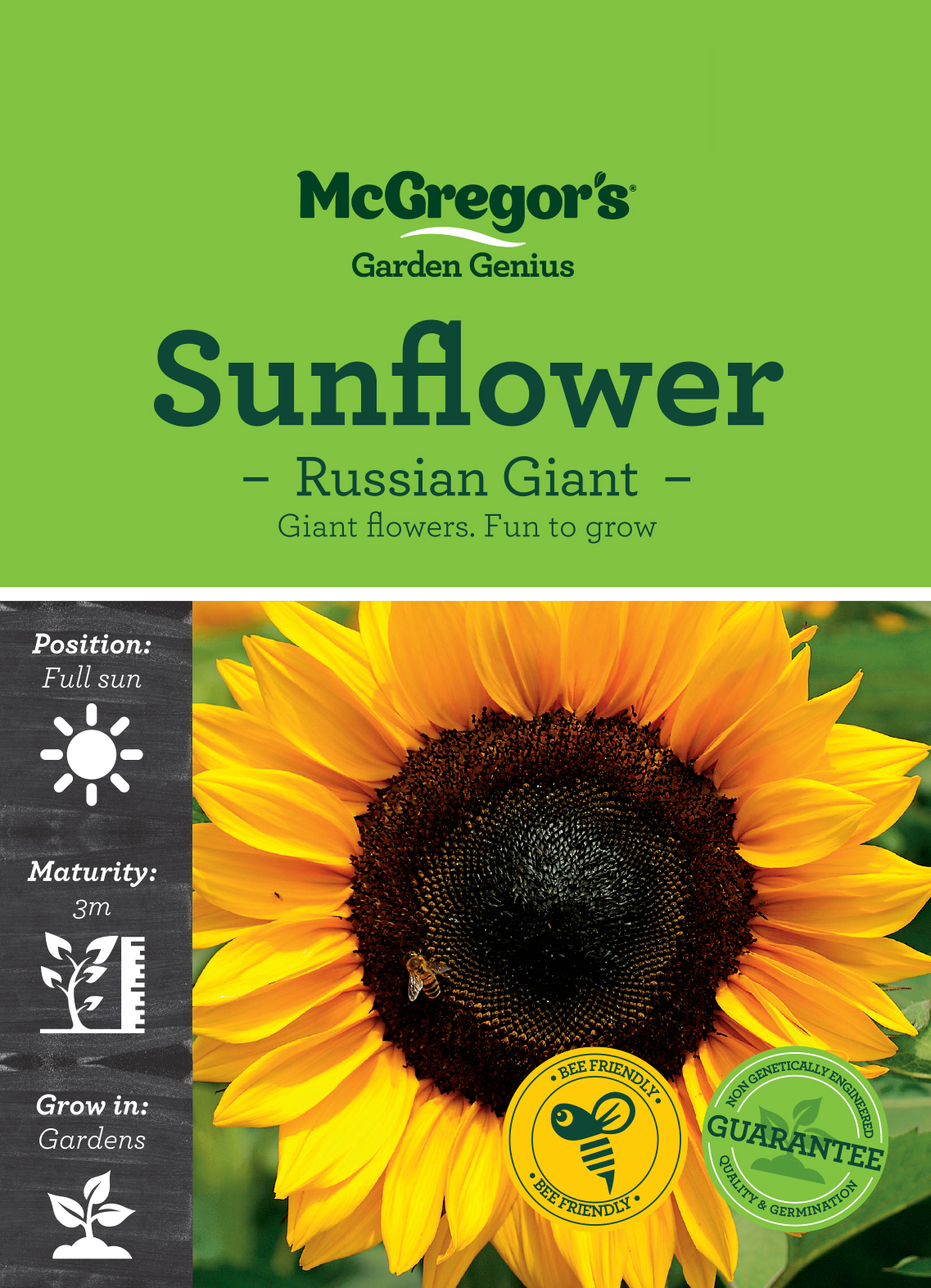 From sowing to flowering in 12 weeks. The classic 'Giant' sunflower has golden yellow flowers and big, strong and tall stems. Give plenty of space, food and moisture to get the maximum size.Where to buy