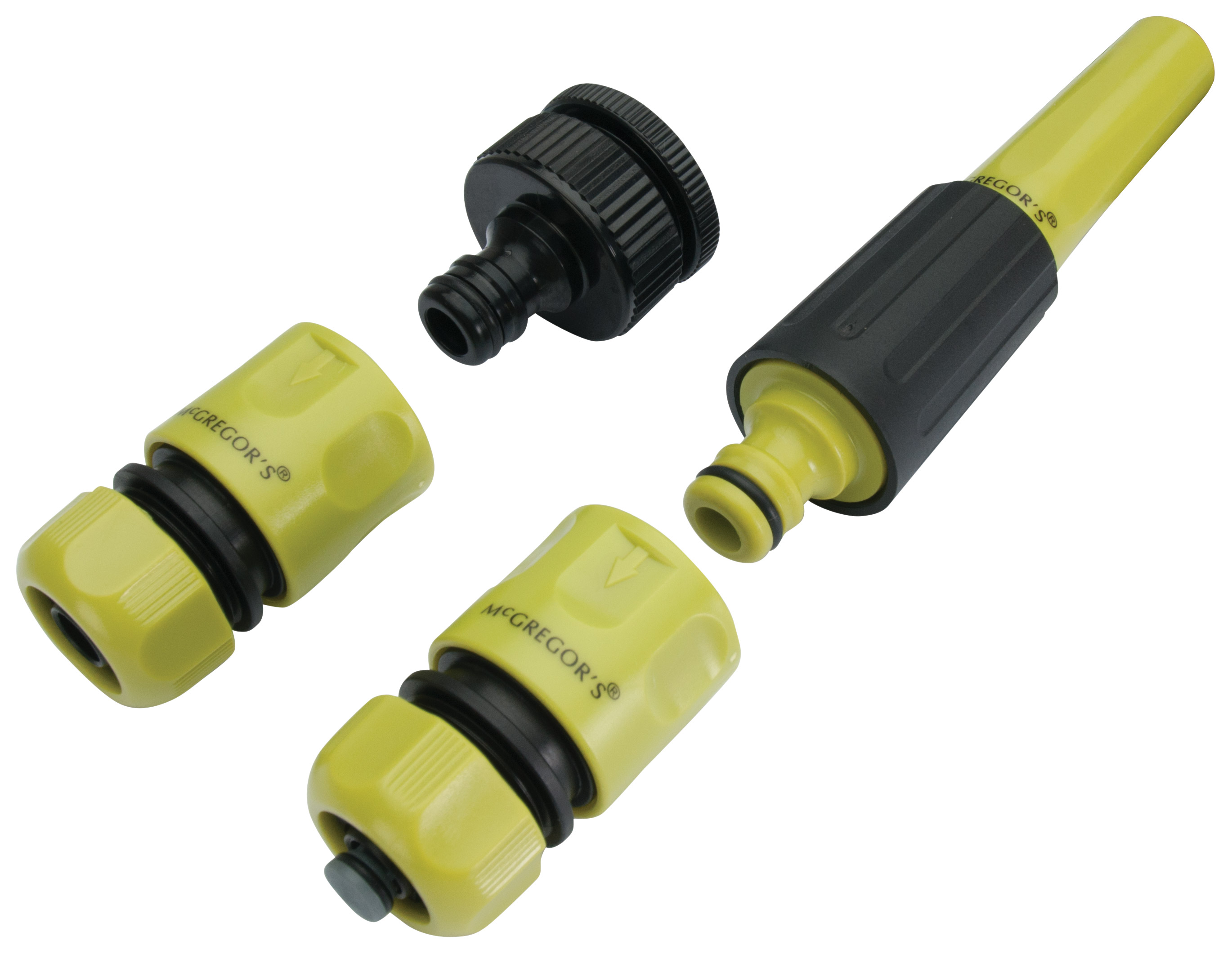 This basic plastic click on hose set contains fittings set to fit 18mm and 25mm taps and for use with 12mm garden hoses. This pack contains: Tap adaptor, hose connector, hose connector with stop valve and adjustable hose nozzle.Where to buy